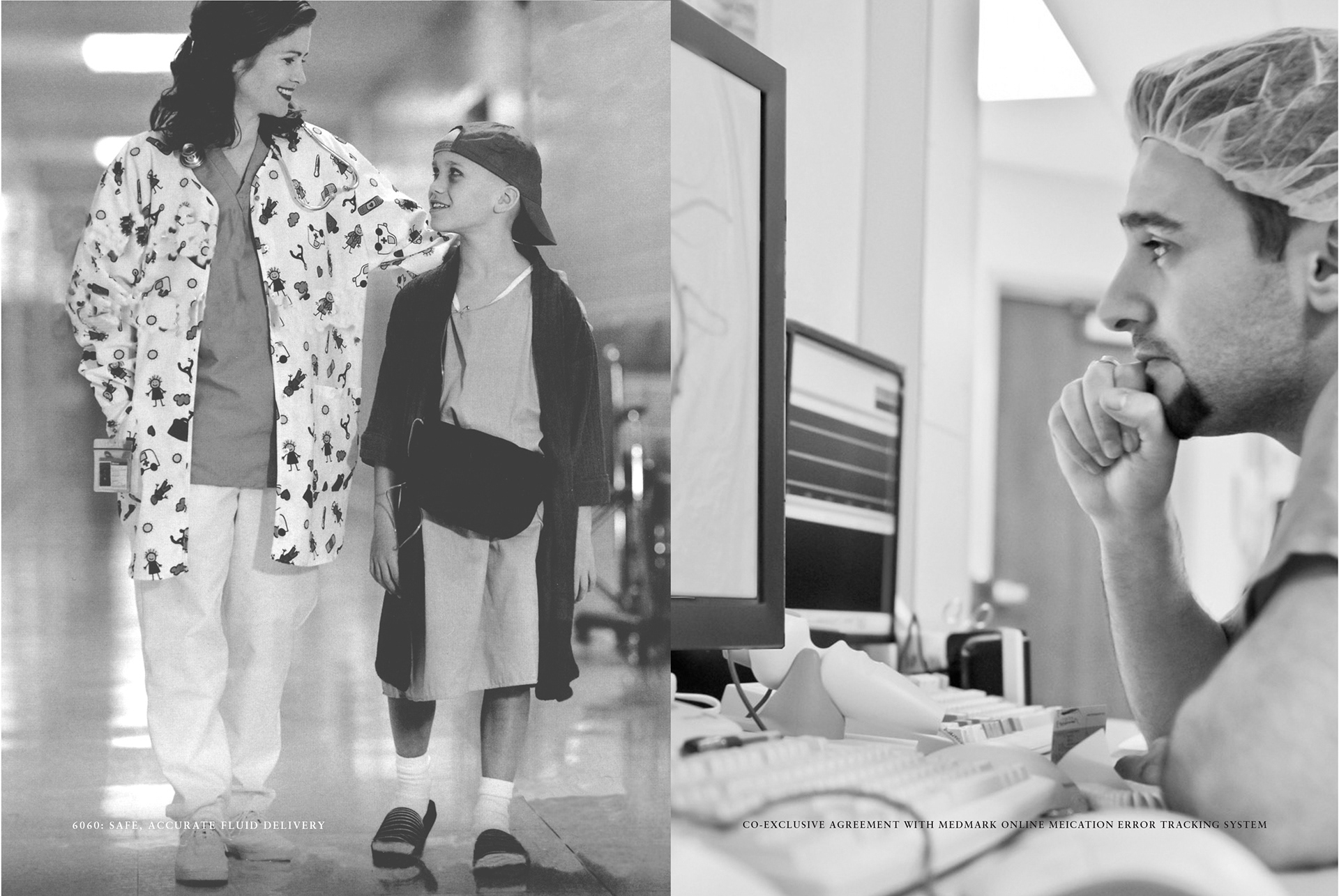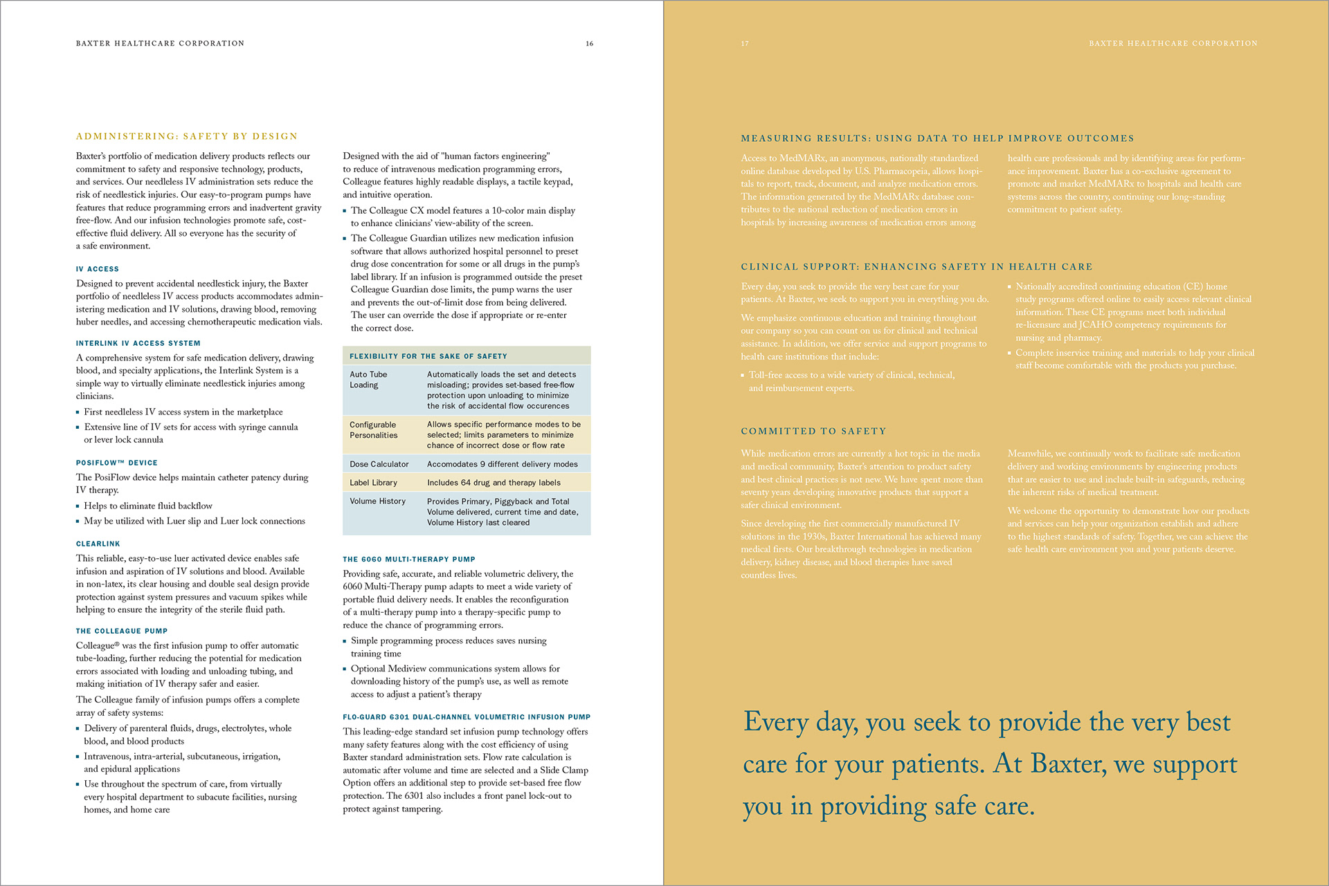 Baxter wanted to promote its emphasis on safety to doctors and other health care professionals considering its products. A brochure highlighting safety spoke directly to this population. Other sales collateral emphasized a clean, clear look.